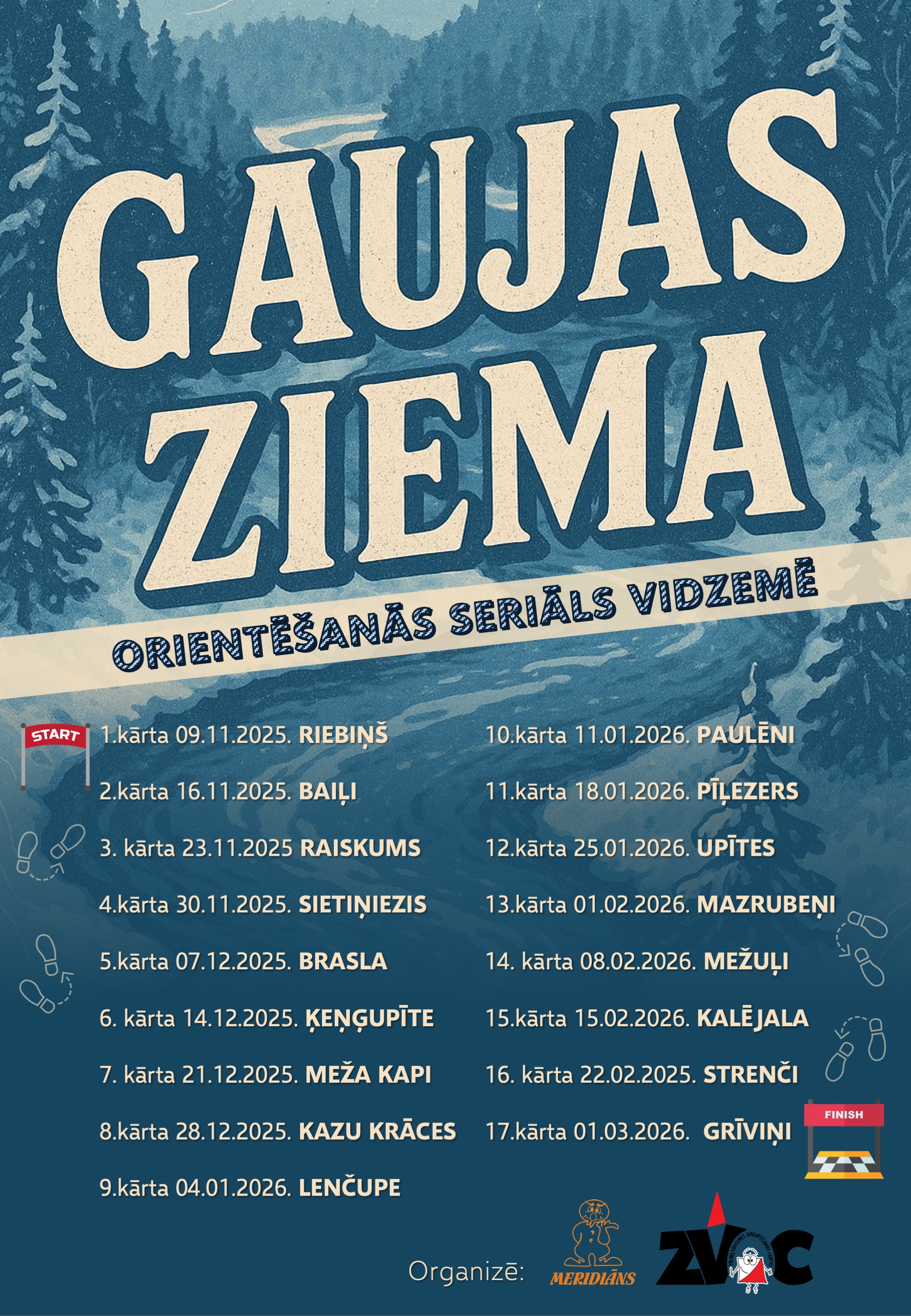Orientēšanās Vidzemē turpināsies arī ziemā! OK Meridiāns sadarbībā ar mūsu Valmieras kaimiņiem - Ziemeļvidzemes orientēšanās centru, no 9.novembra līdz 1.martam katru svētdienu organizē orientēšanās seriālu "Gaujas Ziema 2025-2026". Vairāk nolikumā.