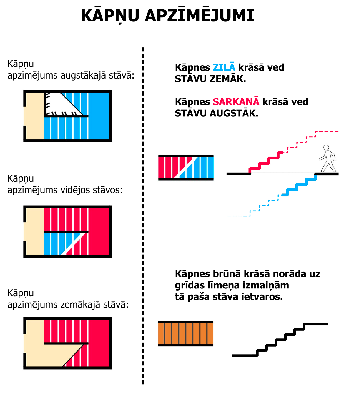 - Ja kartē ar zaļu virziena bultu parādīts konkrēts kustības virziens (gaiteņos, trepēs), tad tas jāievēro.